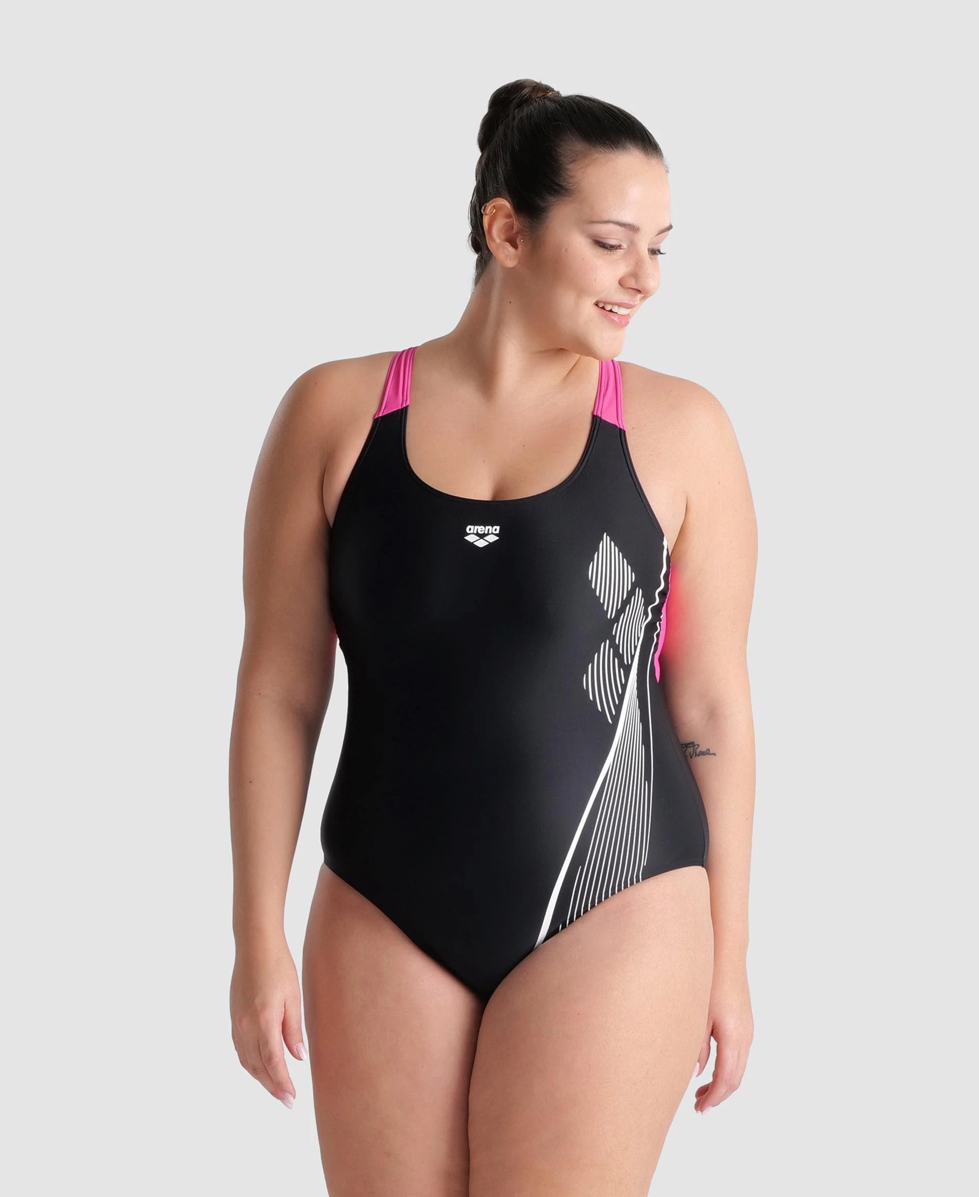 La classica vestibilità arena con una comoda apertura posteriore e ampie spalline di supporto.